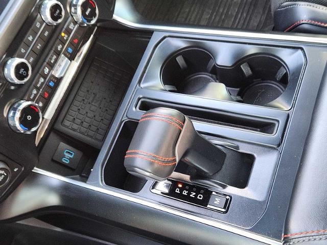 EQUIPMENT GROUP 802A RAPTOR 37 Dual Valve Shocks, Wheels: Raptor 37 Unique 17 Cast Aluminum, Bead lock capable, Carbon Fiber Interior Appliques, Modular Front Bumper, Tires: 37x12.5R17 BSW All-Terrain, GVWR: 7,400 lbs, TWIN PANEL MOONROOF, TRANSMISSION: ELECTRONIC 10-SPEED AUTOMATIC SelectShift w/paddle shifters and terrain management modes: normal, sport, tow-haul, slippery, rock crawl, off-road and baja (STD). Ford Raptor with Shelter Green exterior and Rhapsody Blue interior features a V6 Cylinder Engine with 450 HP at 5850 RPM*.